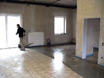 Am 23.01.2010 ist innerhalb von 10 Stunden der gesamte Estrich mit Fliesen im Rüttelbodenverfahren eingebracht worden. Noch während der Estrich abgezogen wird,....
