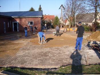 Mitte November haben wir das Pflaster vom Hof aufgenommen, das Erdreich ausgekoffert um die Höhe anzupassen und neu gepflastert.
