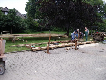 Am 27.06. wurde der Ringbalken und die Säulen gegossen. Gleichzeitig wurde das Bauholz zugeschnitten, gebohrt und verschraubt. Das Bauholz wurde von Privatpersonen gespendet und von dem Sägewerk Schelenburg in Schledehausen kostenlos gesägt und getränkt.