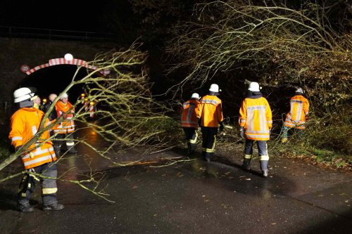 Am Freitagmorgen wurde die Ortsfeuerwehr Wehrendorf um 6.08 Uhr mit Sirene zu einem umgestürzten Baum gerufen. Das Geäst versperrte die halbe Fahrbahnbreite der Zufahrt zum Gewerbegebiet. Unter Einsatz der Motorsäge räumten die Feuerwehrkräfte das Hindernis blitzschnell beiseite.